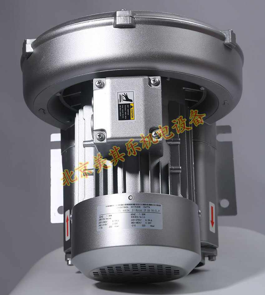 型号:2GH410-H16,三相电850w高压鼓风机参数:最大流量为145立方每小时,额定真空吸力为负160mbar,额定出气压力为160mbar,噪音值为63分贝,净重为16公斤,进出风的口径为1.5寸内螺纹,即ND40。