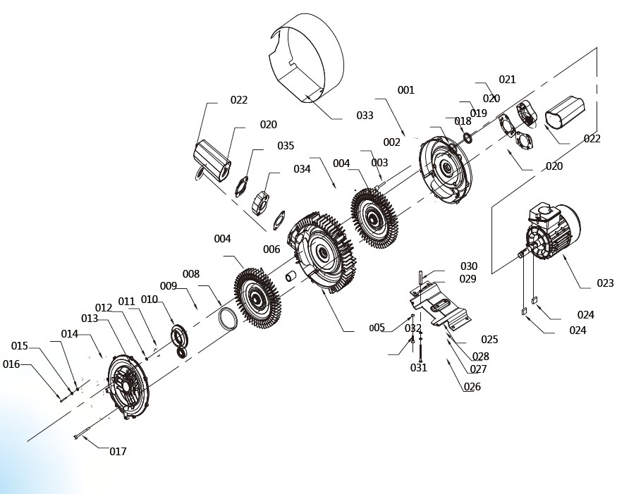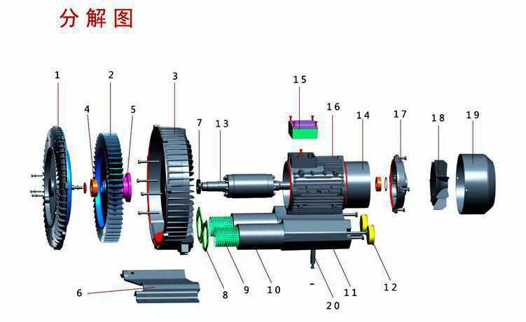 电机部分就不必多说了,前泵体的组成部分有,叶轮、泵体、中泵体、轴套筒、轴承、轴承支架、垫片、油封、泵盖、消声器整体、底座及若干螺丝等。